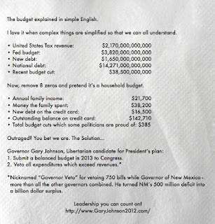 OK, did you click on the image? Good. I'm not going to argue with the numbers listed for our national debt and budget, they seem pretty accurate to me. What I have a problem with is the comparison Mr. Johnson seems to be making between the national budget and a family budget. First of all the annual family income listed, assuming we are talking about a family of 4, seems quite low. If a family actually found itself in a situation where its income was so low as compared to its expenses the family would probably try to cut corners, but they wouldn't stop there. Maybe in this family the mother doesn't work? I bet if most American families found themselves in the situation described by Mr. Johnson they would not only try to cut expenses, they would also try to increase their revenues. Mom might decide to take a job. Maybe if Dad is the person working he would try and get a part time to job along with Mom taking a job.